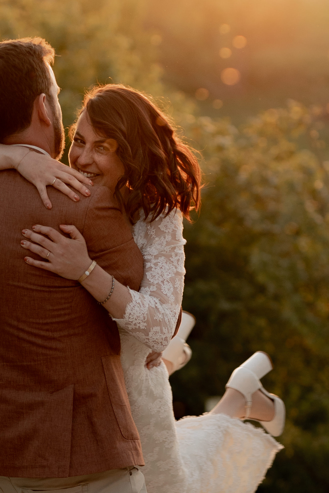 Mathilde : Oh que c’est dur… Notre mariage entier est un beau souvenir ! Mais je dirais qu’il y a eu trois moments particulièrement forts. Le moment le plus intense reste lorsque mon papa m’a découvert dans ma robe de mariée. Puis, le moment le plus doux fut la route vers le Domaine de La Guichetière, avec Laurent dans notre vieille Citroën, une vraie bulle à deux. Enfin, le moment plus fou et le plus drôle fut la soirée avec la quinzaine de copains qui sont restés debout jusqu’au petit matin.