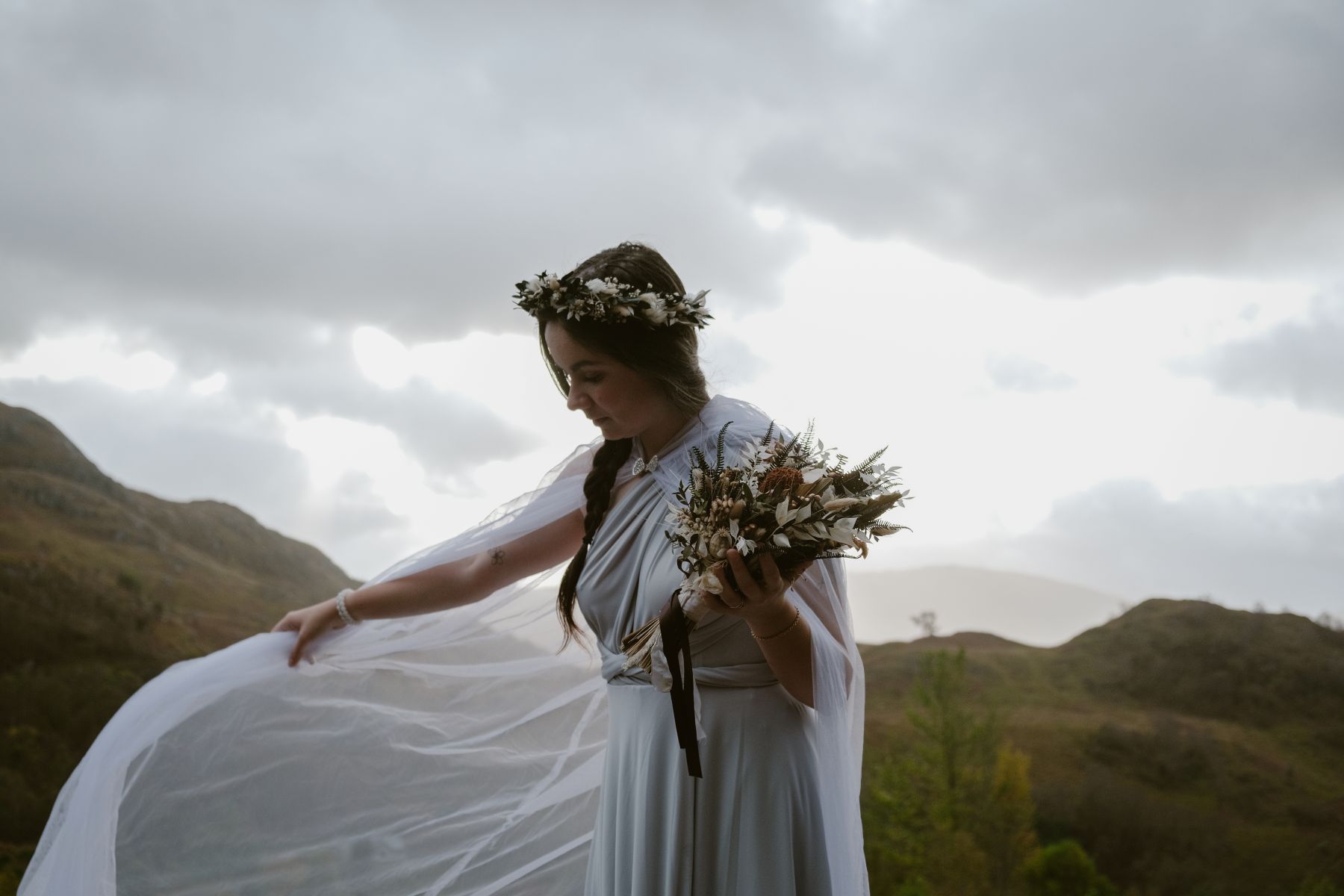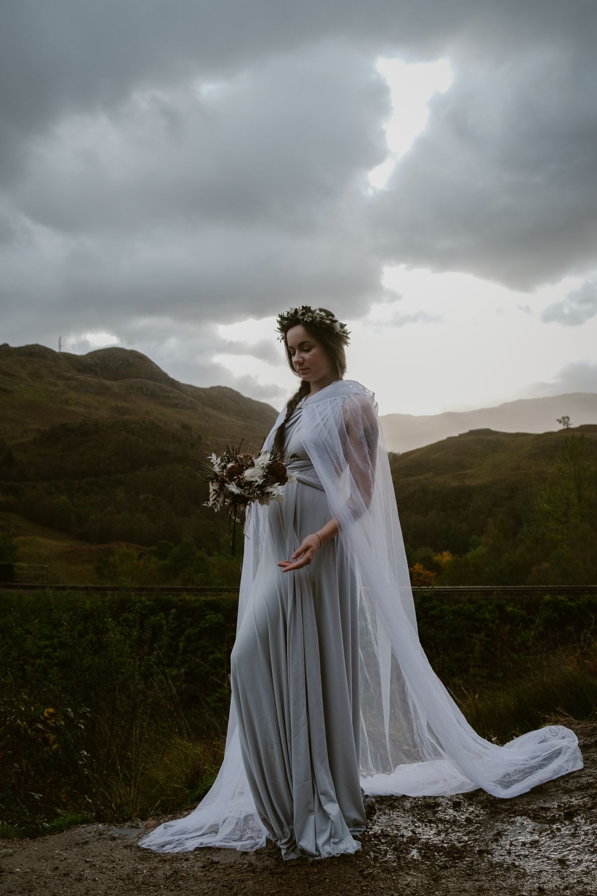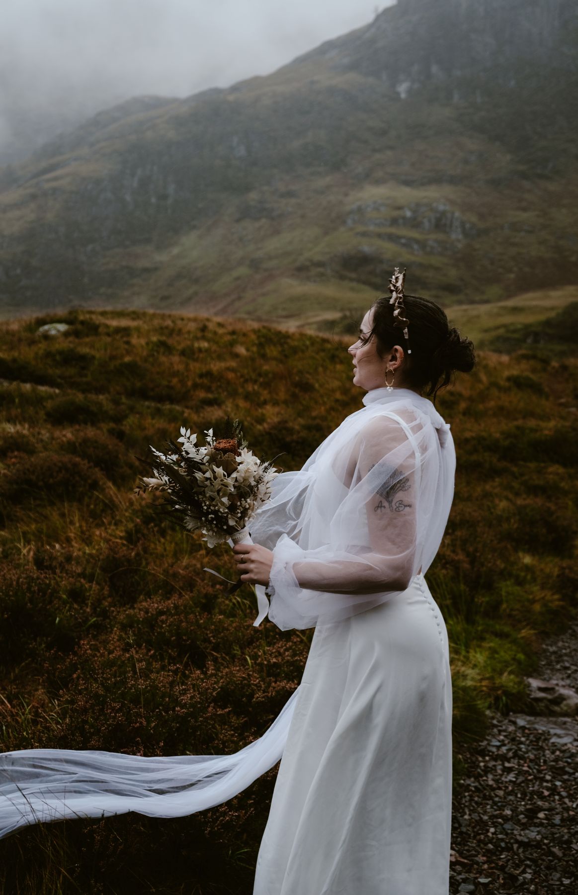 Au pied de trois montagnes emblématiques des Highlands, la nature offre un paysage spectaculaire. C’est ici que Lauriane Joffres capture son image favorite. La robe blanche et lumineuse contraste avec la roche sombre, tandis que les gouttes de pluie enveloppent la scène d’une atmosphère onirique, incarnant parfaitement l’esprit d’un elopement en Écosse.