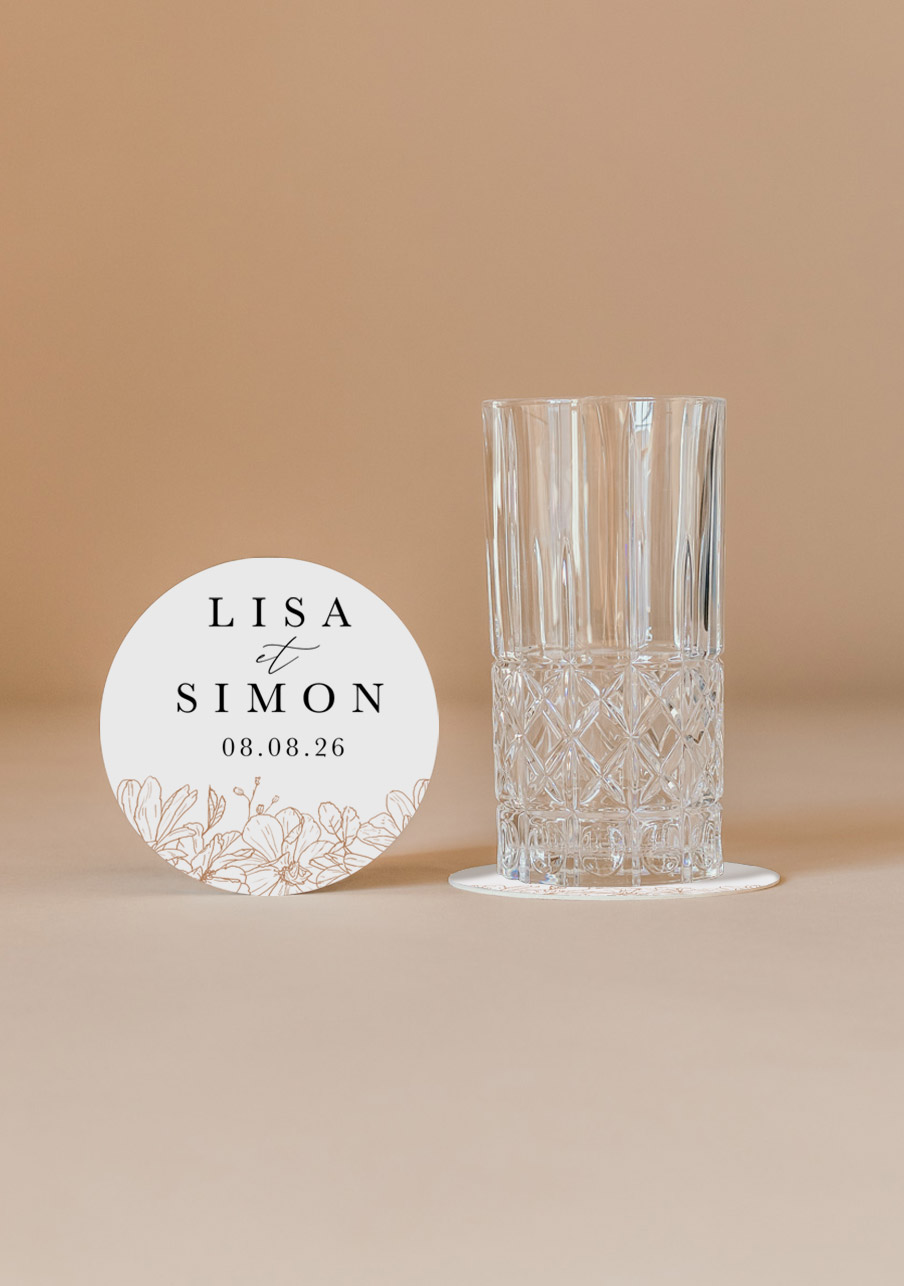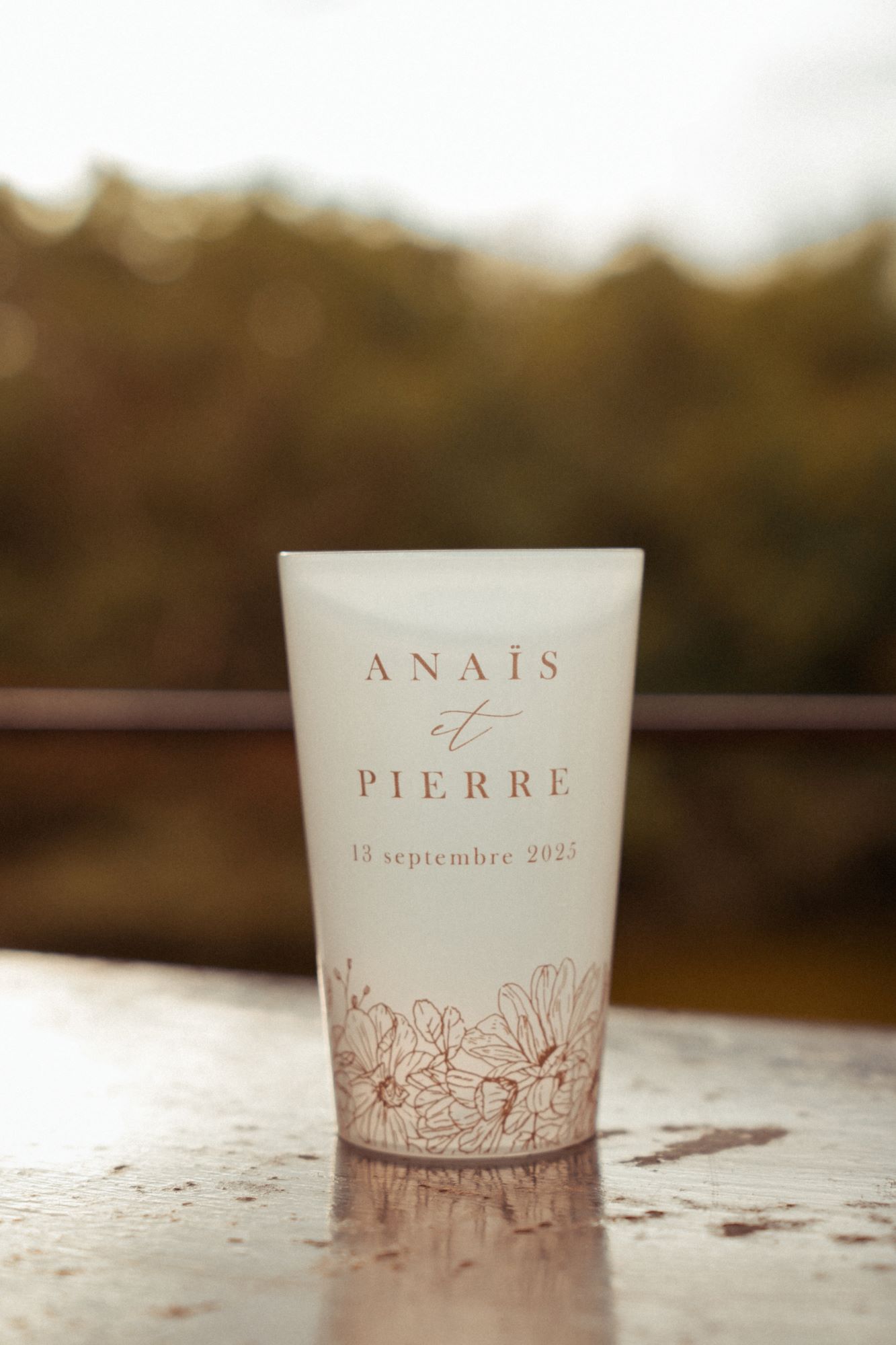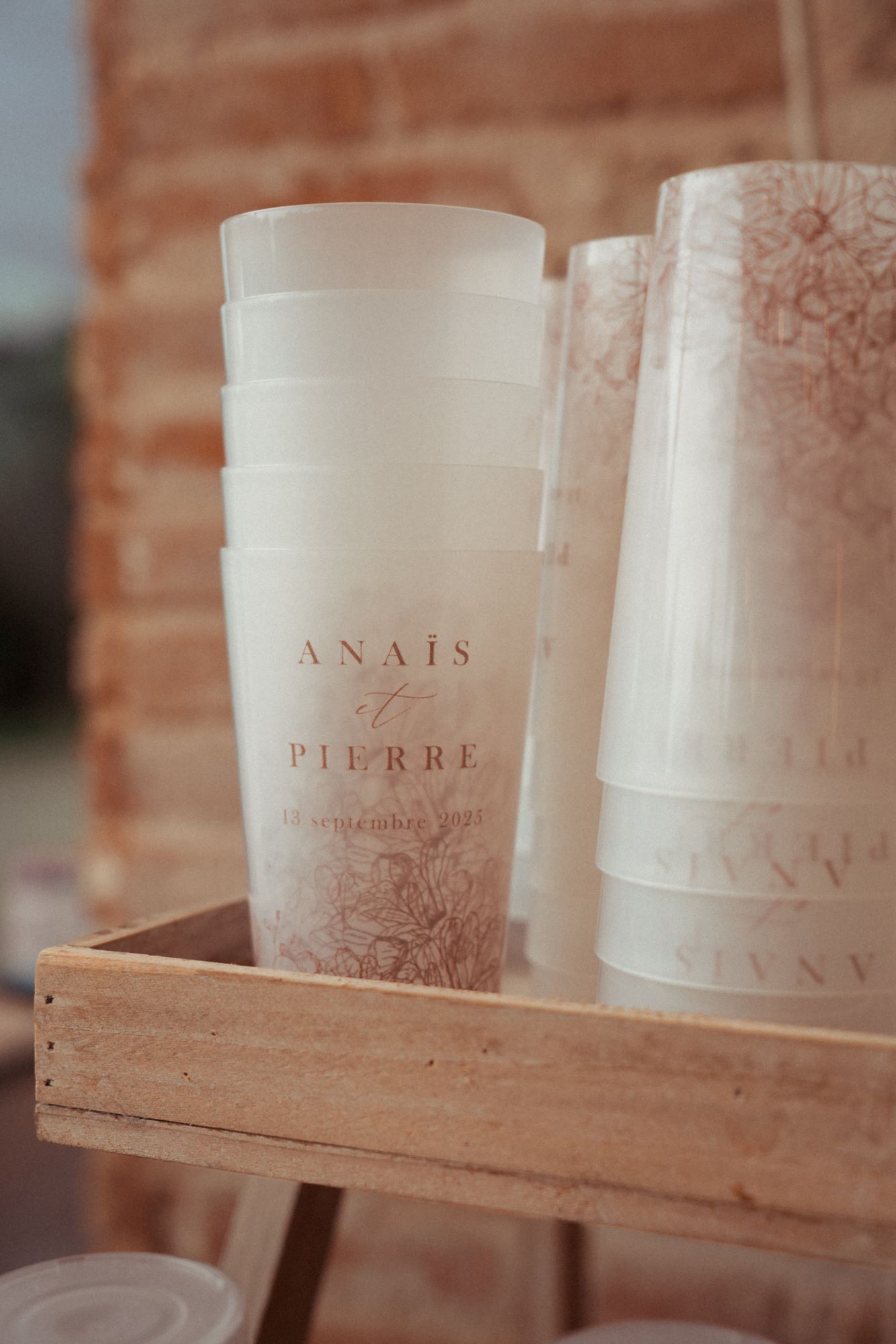 Sur leur site, nous avons immédiatement flashé sur le modèle Devon, qui correspondait au style de notre décoration élégante, délicate et naturelle. Nous avons pu choisir les couleurs de nos gobelets personnalisés* et avons alors opté pour la teinte conductrice de notre mariage : une sorte de beige marronné. Après validation du bon à tirer (BAT), nos gobelets personnalisés sont partis en impression et nous ont été envoyés. Si vous êtes frileux ou incertain·e·s, sachez qu’il est possible de commander en amont un échantillon non personnalisé.