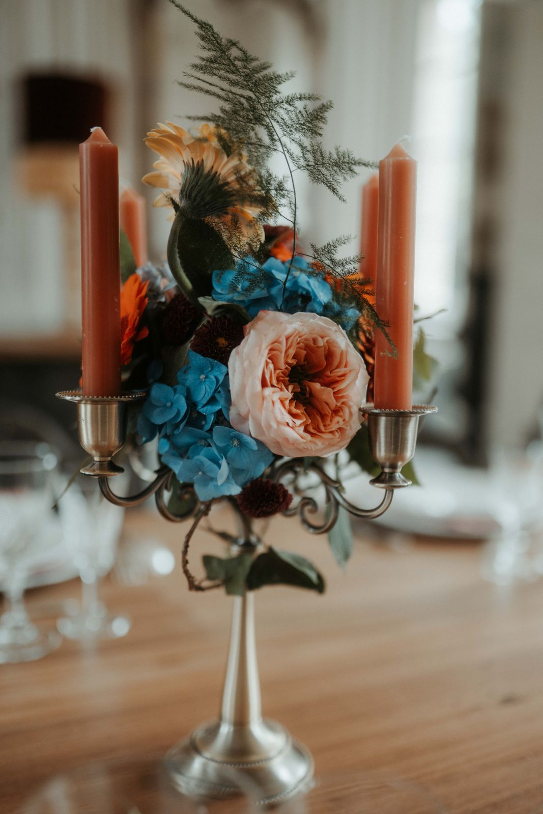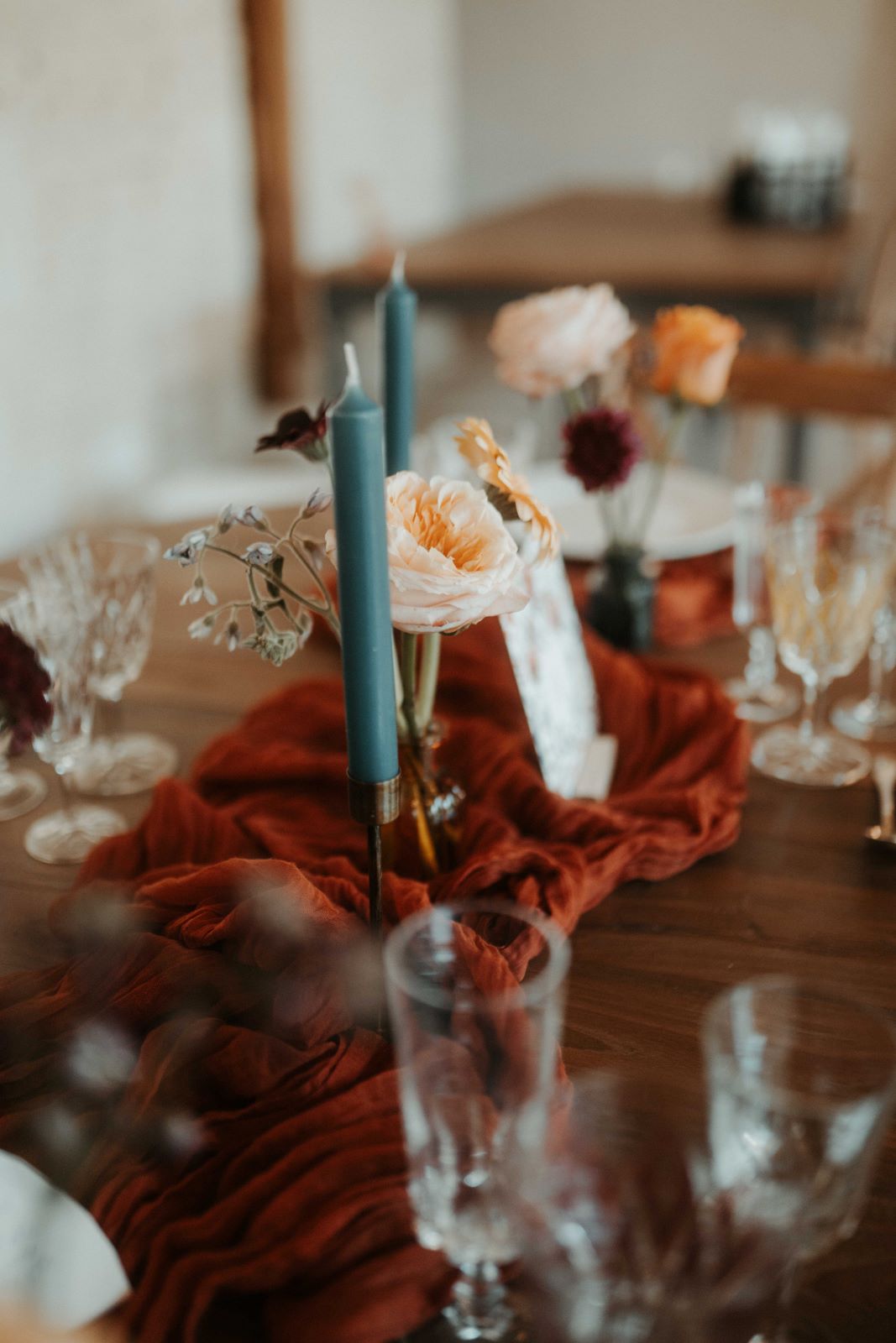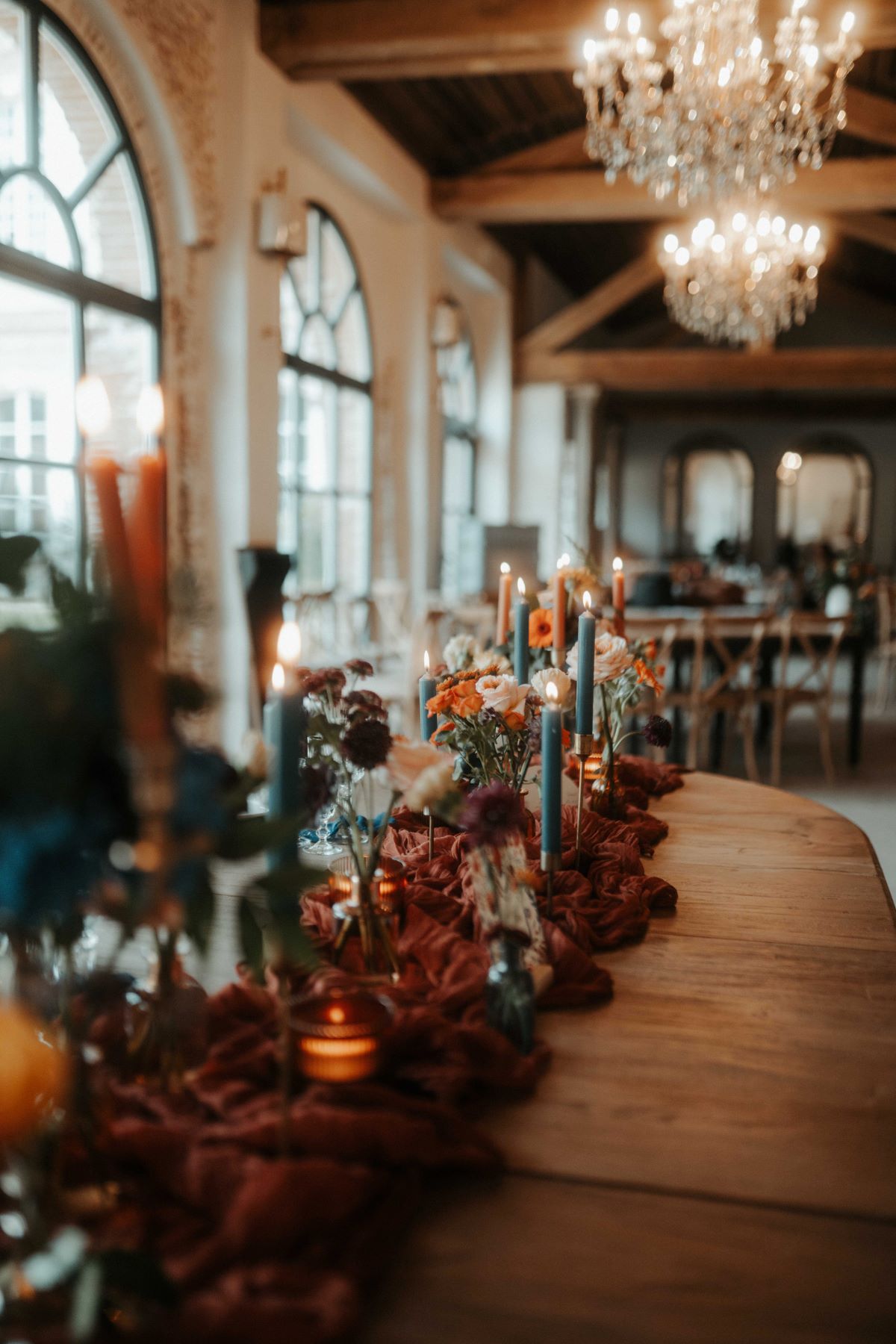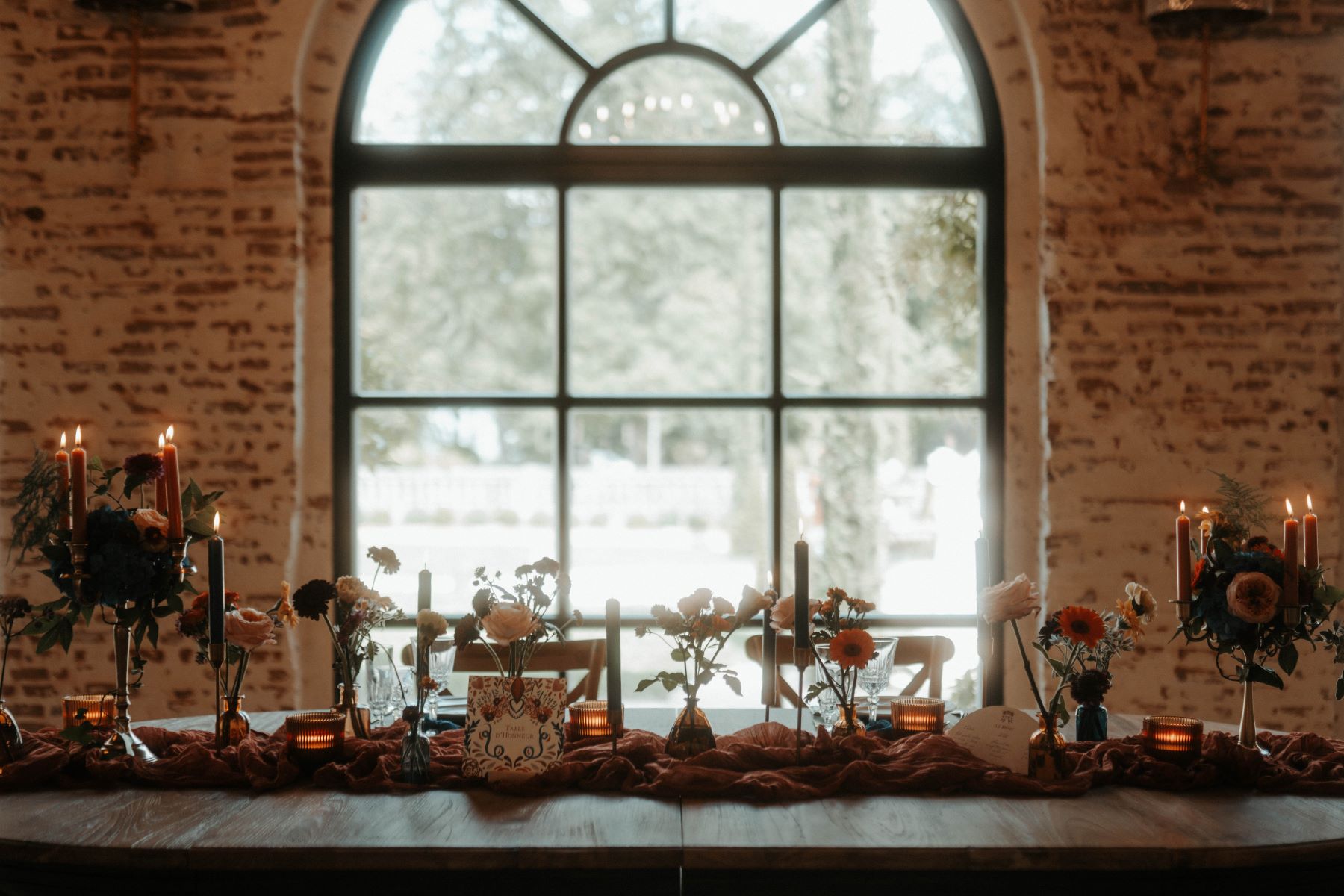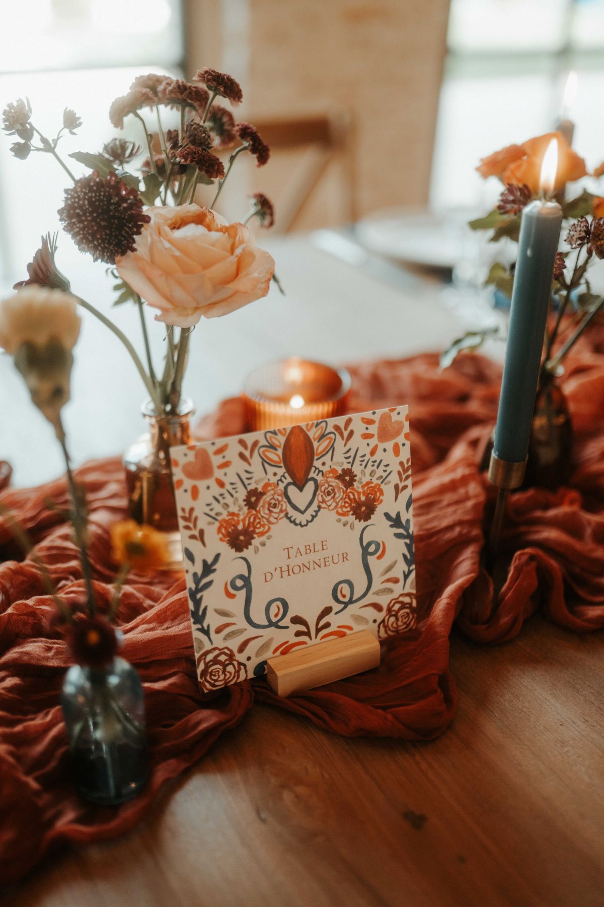 La salle de réception du château s’est parée de couleurs ensoleillées ! Sur les tables, des chemins de tissu froissés, des chandeliers en laiton doré, des bouquets de fleurs fraîches et la papeterie peinte à l’aquarelle par Rosir Atelier, composent une ambiance festive et élégante, fidèle à l’esprit de ce mariage franco-mexicain.