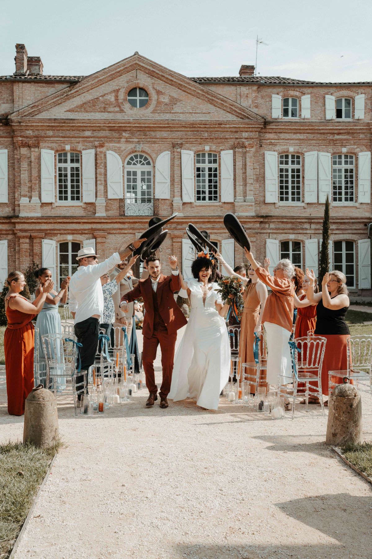 C’est dans la véranda du Château du Pujolet que les mariés se découvrent. Face à face, ils prolongent la surprise jusqu’au dernier instant, leurs visages dissimulés derrière des sombreros, en hommage à leur mariage franco-mexicain. Dans un geste complice, ils abaissent leurs chapeaux et se révèlent enfin l’un à l’autre. Ce moment intime est capturé avec discrétion par la photographe Ilys Films et le vidéaste Brice FPV Films.