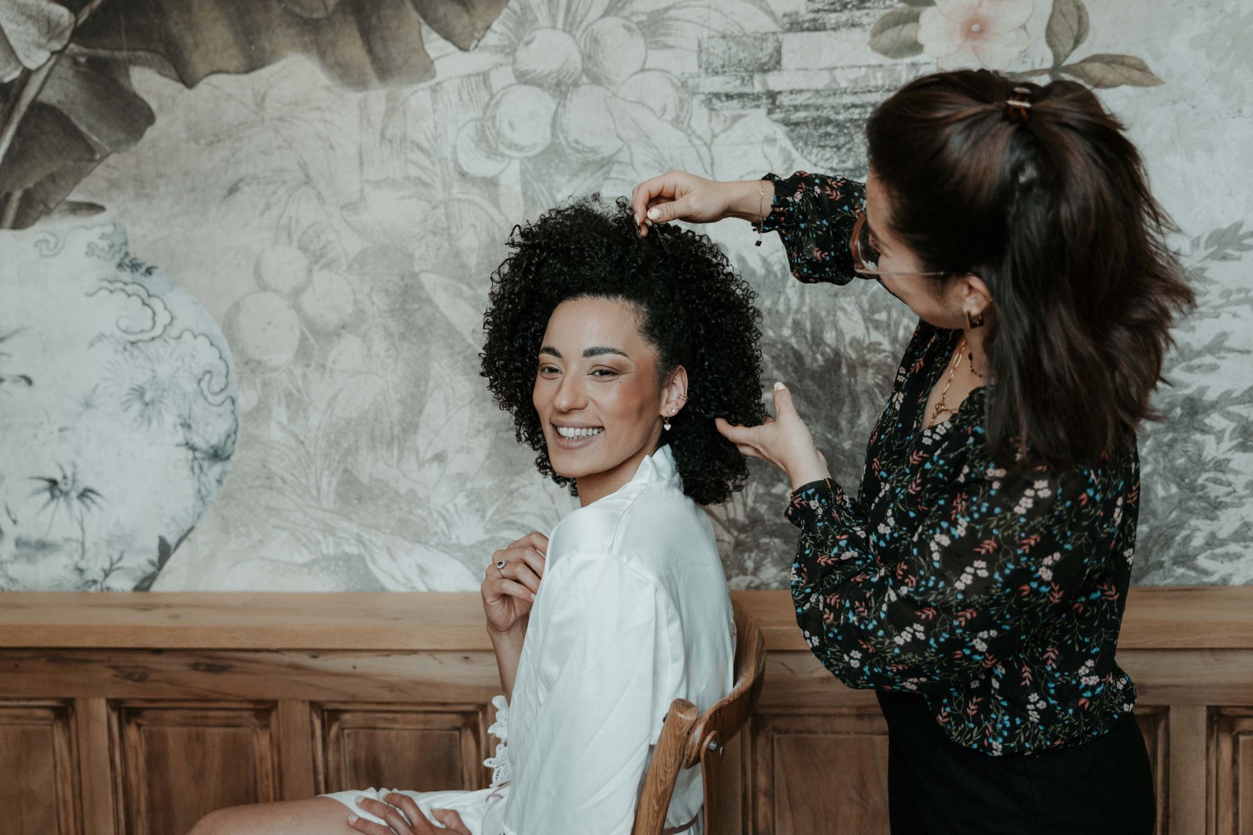 Dans l’une des chambres du château, la mariée se prépare, entourée de ses témoins. Les rires résonnent, les robes s’agitent et la magie opère. WL Makeup Artist sublime le teint de la mariée, tandis que Maora réalise une coiffure moderne, ornée d’une couronne florale mexicaine, créée par la fleuriste Flower in Love. Puis, elle enfile sa longue robe signée Bérangère A., ornée d’un voile fleuri et coloré et accessoirisée des bijoux Uniyou, en perles d’eau douce.