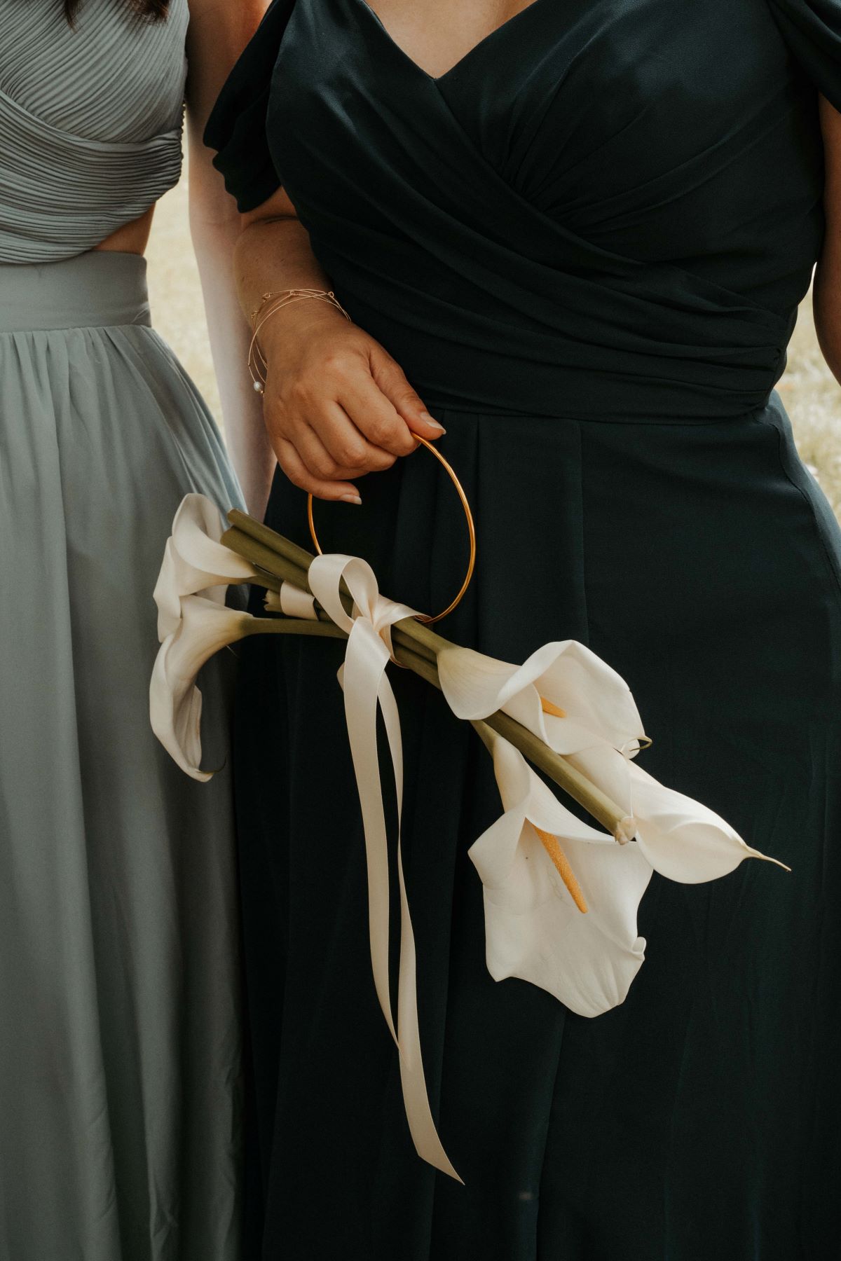 De leur côté, ses témoins portent chacune une jolie robe Rose Bonheur, les bijoux fait-main Ninouch et un bouquet en forme de sac à main, composé de lys.