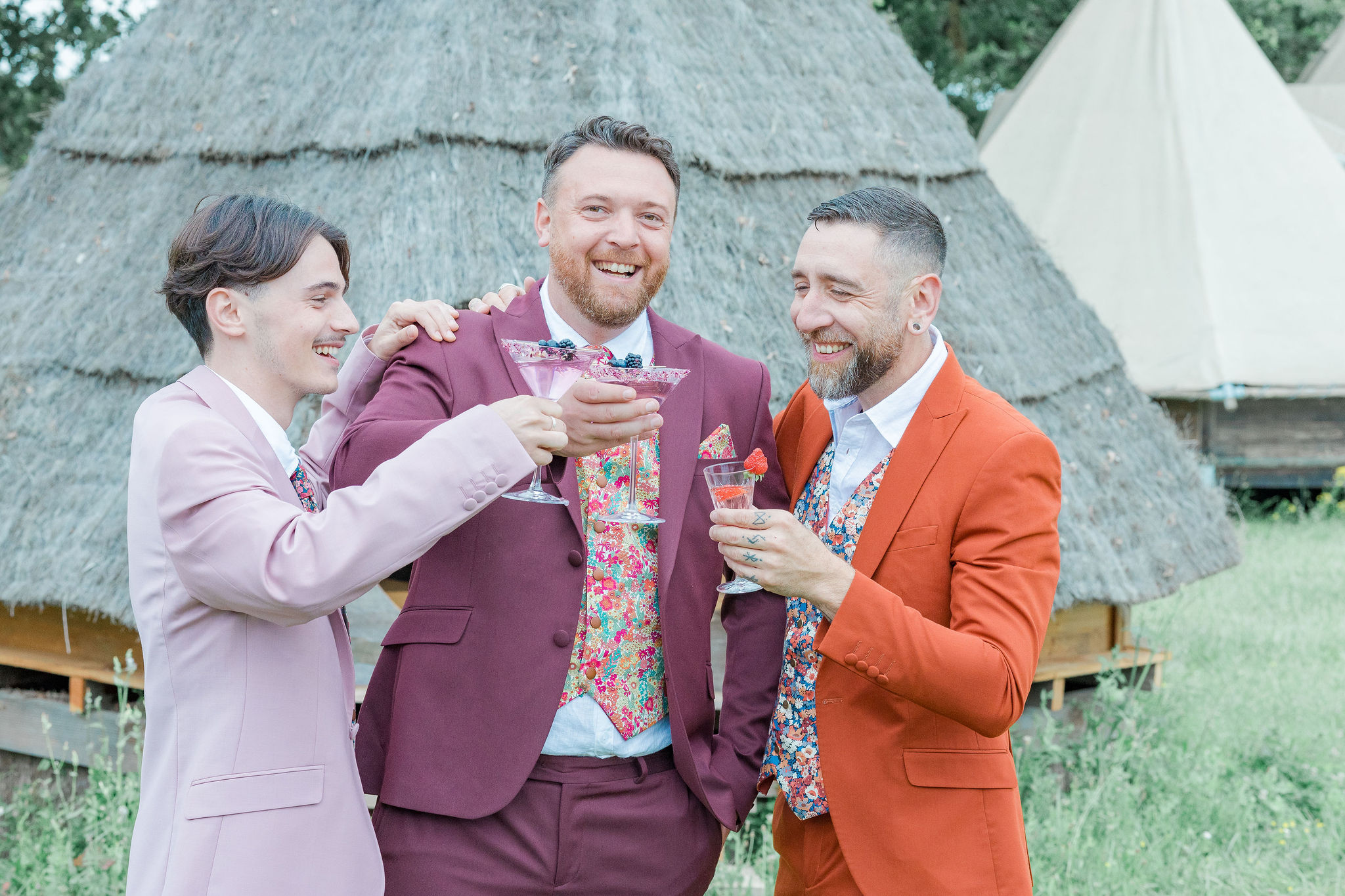 Puis, dans l’une des huttes du Domaine d’Escapa, lui et ses deux témoins enfilent leurs costumes colorés Un Jour Un Costume, rehaussés par les accessoires liberty de Monsieur Victor. Pour se relaxer avant le grand moment, ils trinquent ensemble et savourent les cocktails gourmands Drunk In Love. L’ambiance est à la fête !
